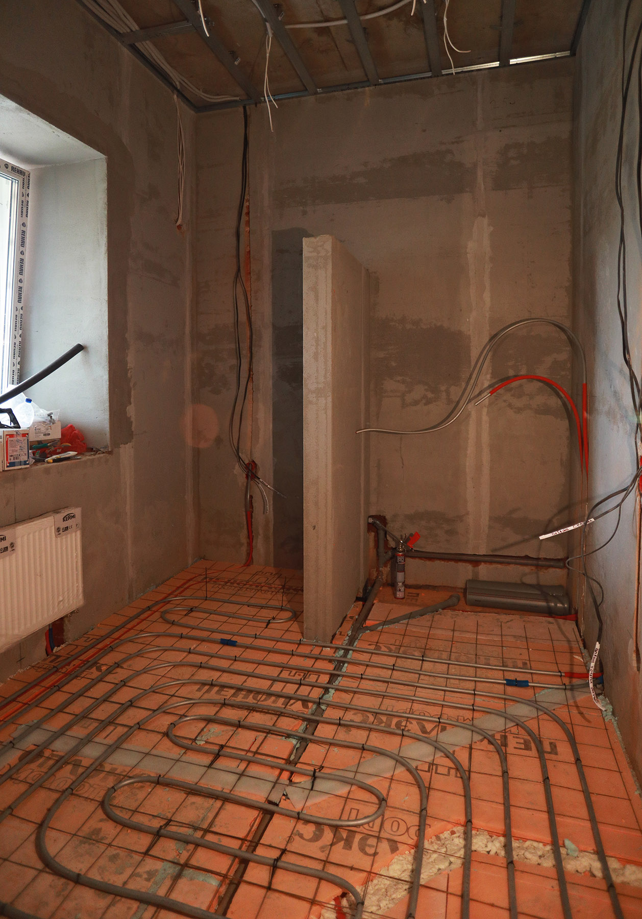Во всём доме были уложены тёплые полы и залита новая стяжка, проложена электрика и инженерные коммуникации. Существующие и новые стены были подготовлены под покраску.