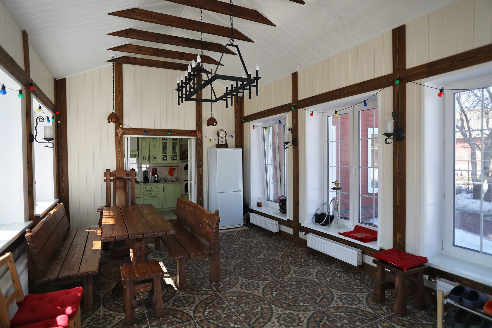 Важным элементом в новом доме стала просторная и уютная веранда для больших застолий и неспешных воскресных завтраков, откуда открывается вид на сад и лес. Несмотря на большую площадь остекления, в помещении комфортно в любую погоду.