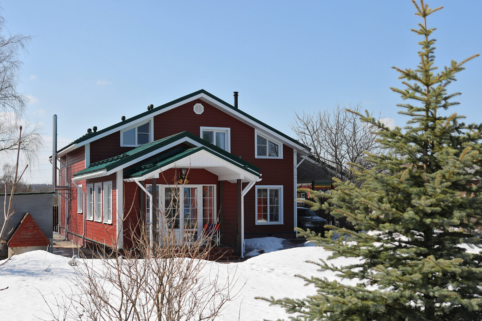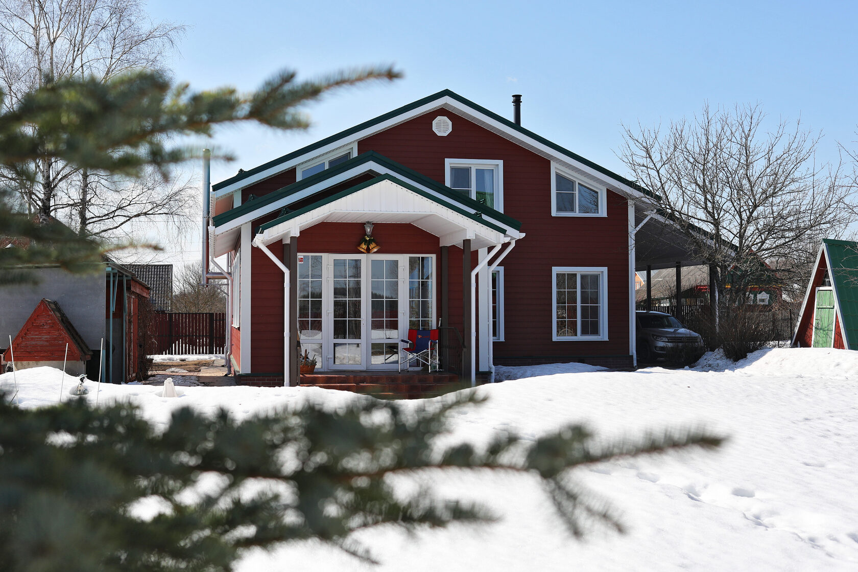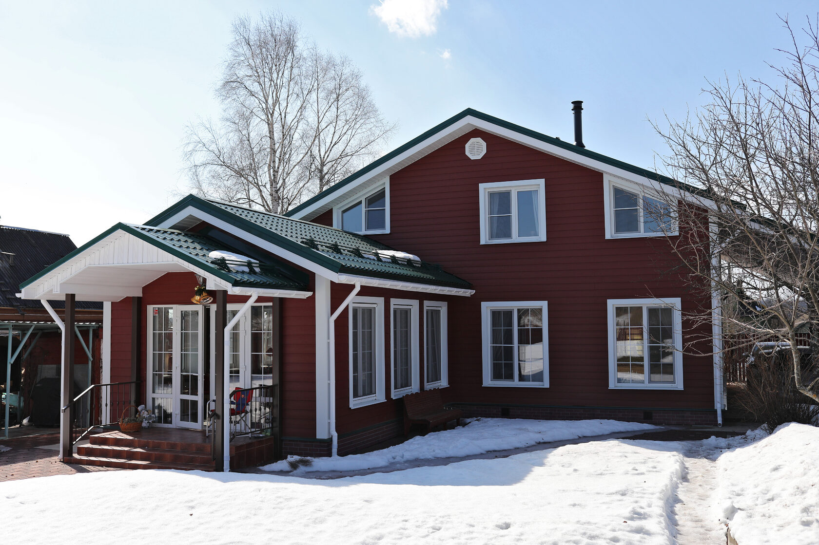 Для отделки фасада мы использовали красный фиброцементный сайдинг, который идеально сочетается с зелёной черепицей и белыми карнизами.