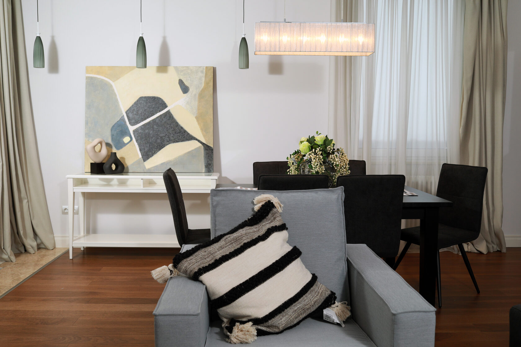 В концепции 3-х цветов мы нашли множество отличных дизайн-решений таких, как подвесные светильники, картины, а также микроэлементы декора.