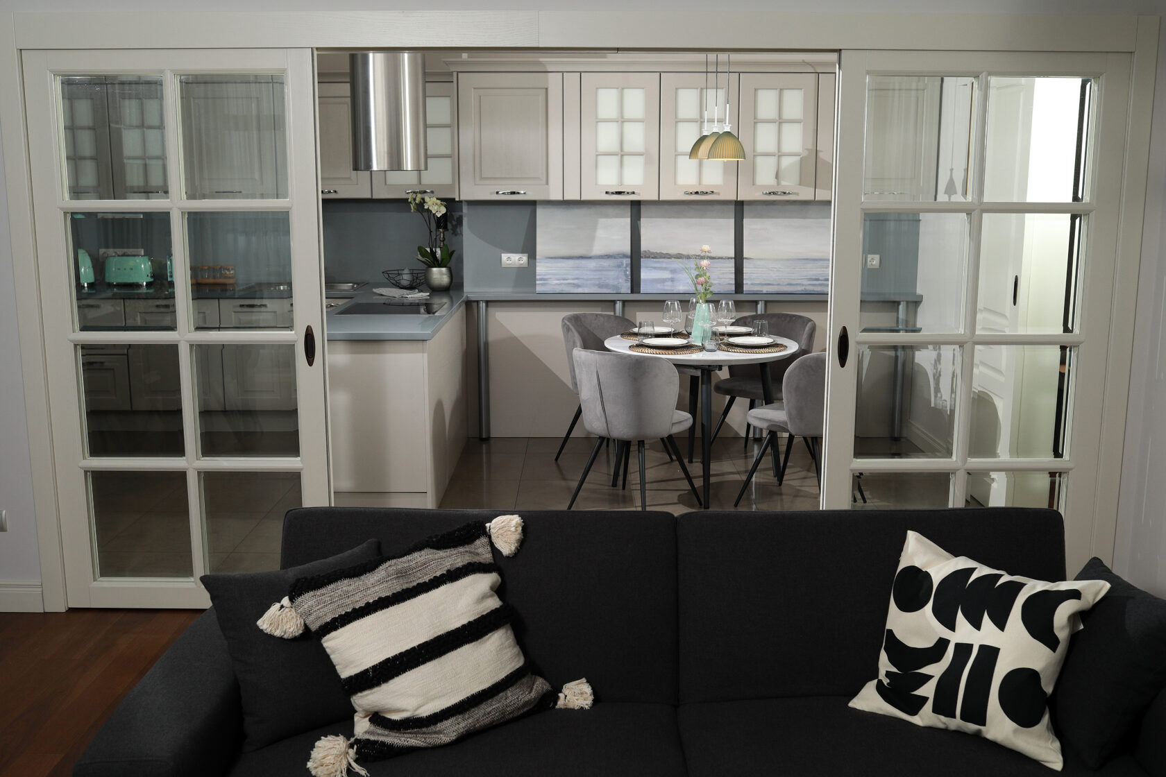 Работа наших дизайнеров впечатлила заказчика и мы остановились на варианте с широким дверным проемом между кухней и гостиной.